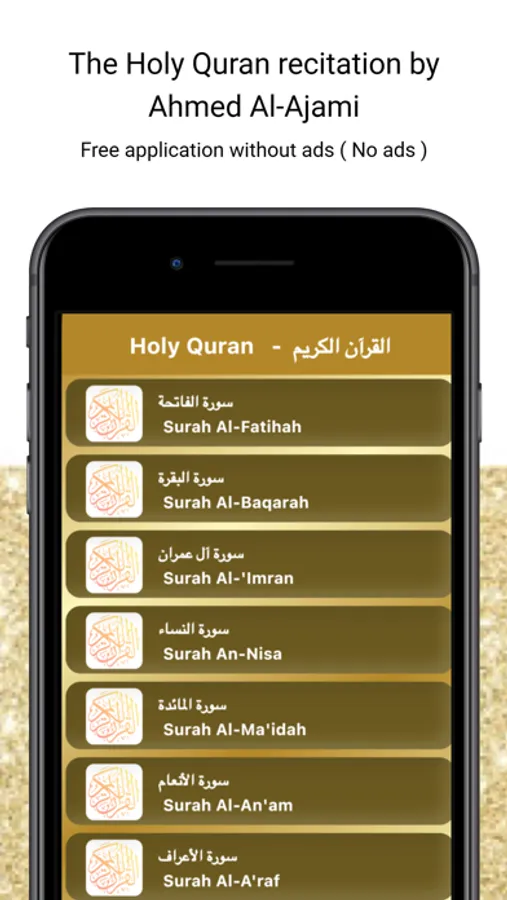 The application of the Noble Qur’an recitation by Ahmed Al-Ajami, allow you to listen to all chapters of the Holy Qur’an without Internet from your cell phone or your mobile