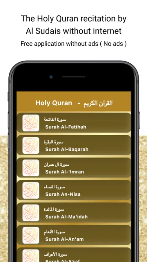 The application of the Noble Qur’an recitation by Abdulrahman Al Sudais, allow you to listen to all chapters of the Holy Qur’an without Internet from your cell phone or your mobile .