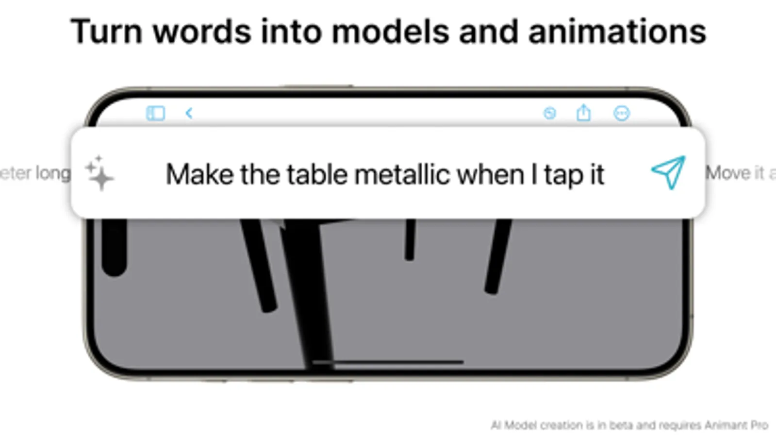 Animant’s AI features make composing virtual scenes a breeze. Instead of learning complex timelines and structures, all you need to do is focus on the story you’re trying to tell, and ask Animant to create it for you. Speed up model creation just by asking, like “Create a metallic desk one metre long and half a metre tall”. Create interactive animations, like “Change its material to marble when I tap it”. And 3D Scan makes it effortless to bring your real world into your story.