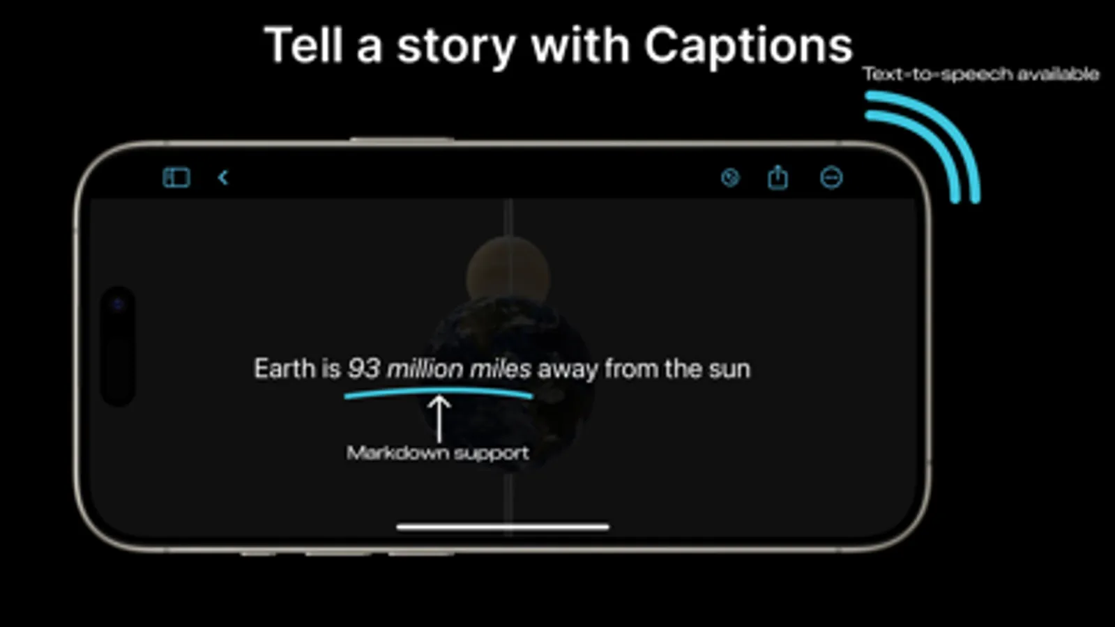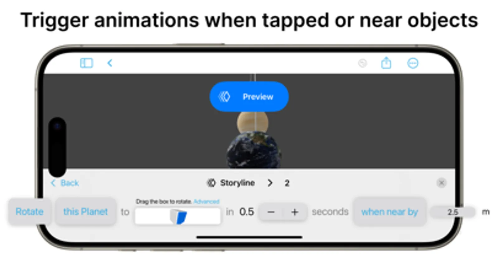 3D Scan: Bring your physical space into your virtual scene in an entirely magical way just using your device’s camera. Create a detailed 3D model from a real object (requires an iPhone or iPad with LiDAR or a Mac for processing), or create a 3D plan of your room (requires iPhone or iPad with LiDAR scanner). You can even combine Room and Object captures to see how furniture would affect your room’s space, and animate it all together with Storyline. 3D scans are fully compatible with USDZ so they're ready for your next big project.