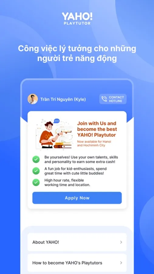 Starting from 60,000 VND/hour for Vietnamese tutoring and play sessions and 80,000 VND/hour for English tutoring and play sessions, you can earn higher wages for special sessions. If you work hard at YAHO!, your teaching and care skills will be enhanced, and so will your salary!