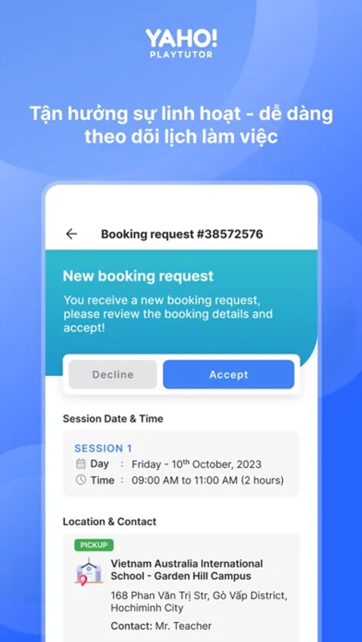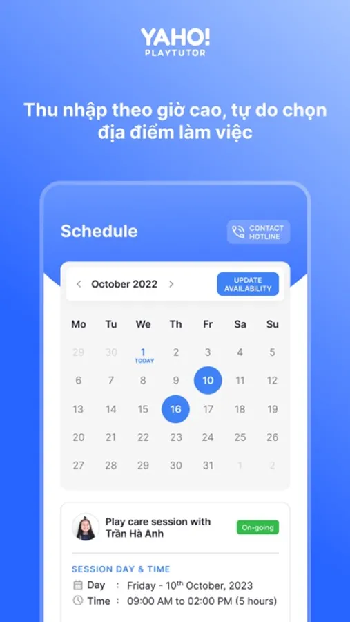 Being a Playtutor tutor is a perfect and useful part-time job. With the YAHO! Playtutor app, associates can easily find suitable sessions based on their travel distance, arrange flexible working hours, and receive corresponding suggestions based on their abilities and skills.