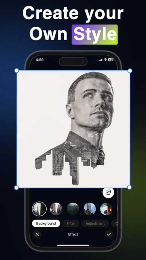 Discover the power of picture overlay and unleash your artistic touch with Blend Photos. It offers a range of photo blender features at your fingertips - from basics like cropping and rotating to more complex tools like creating double exposure or photo mixer and picture overlay. With the selection of highly customizable photo blender effects, you can craft blend photos that look proffesional and polished in a few seconds.