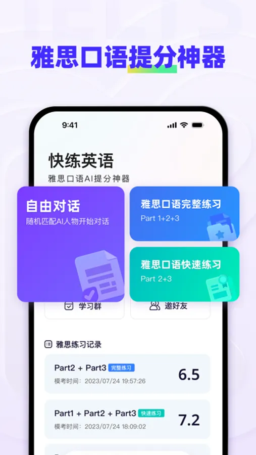 快练英语是基于强大AI技术的免费雅思口语提分神器。给你全新的英语口语学习体验,随时随地沉浸式对话,陪你雅思口语模拟训练,让你有效提升英语口语能力,助你雅思口语考出理想成绩。支持多种AI真人语音自由对话练习、多国考官选择、优秀范例提示、专业雅思模考评分及解析、AI语法纠错及建议。快练英语,让Al成就你的雅思口语未来!