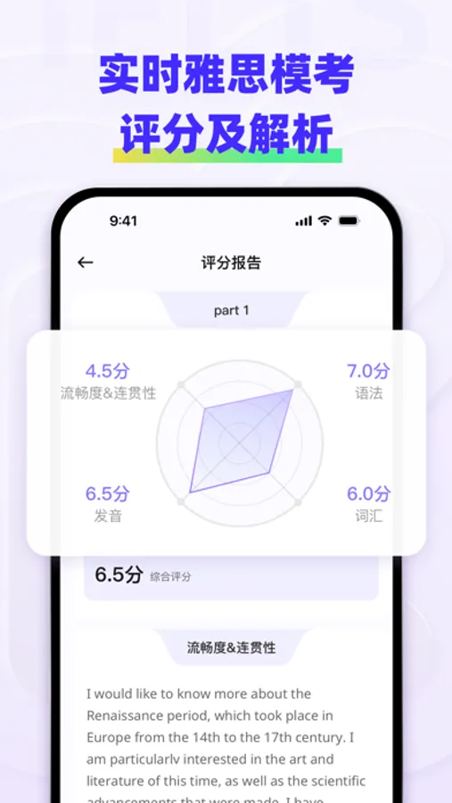 模拟雅思口语考试,并实时给出专业评分和详细解析,如流畅度&连贯性、语法、发音与词汇,让你充分了解自己的强项和劣势,辅助你提高口语考试成绩。