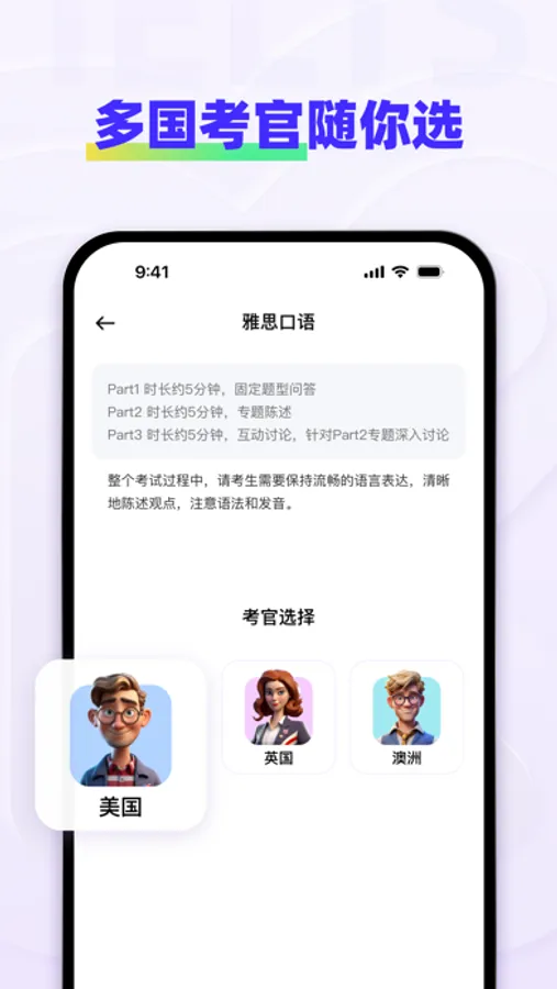 我们为您提供多国考官选择的功能。您可以与来自英国、美国和澳洲的考官进行一对一的模拟练习,帮助您适应不同的口音和语速,真实还原考试的效果。这样,您可以更好地准备雅思口语考试,提高口语表达能力。