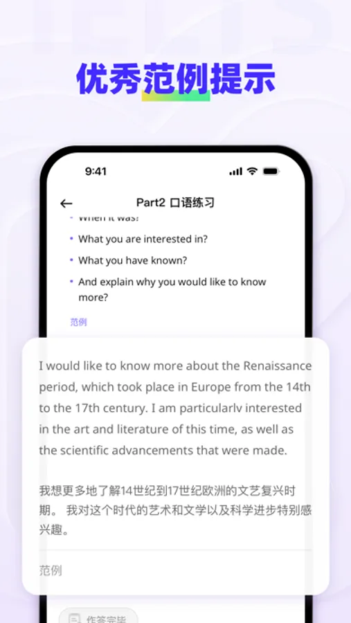 在遇到卡顿或者表达不准确的情况时,我们的示例问答功能将会是你的强大助手。只需轻轻一点,应用将会根据你的语音输入,提供标准、地道的示例表达,引导你找到完美的答案。