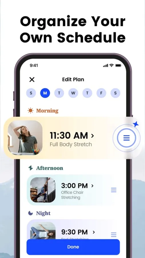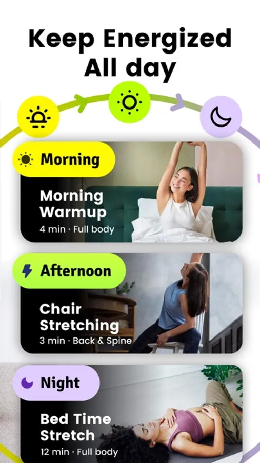 Make an easy stretch anytime and anywhere! From morning warm-up to evening bed stretching, conveniently creates a relaxing plan for a busy day.
