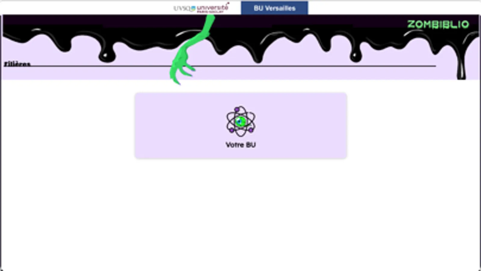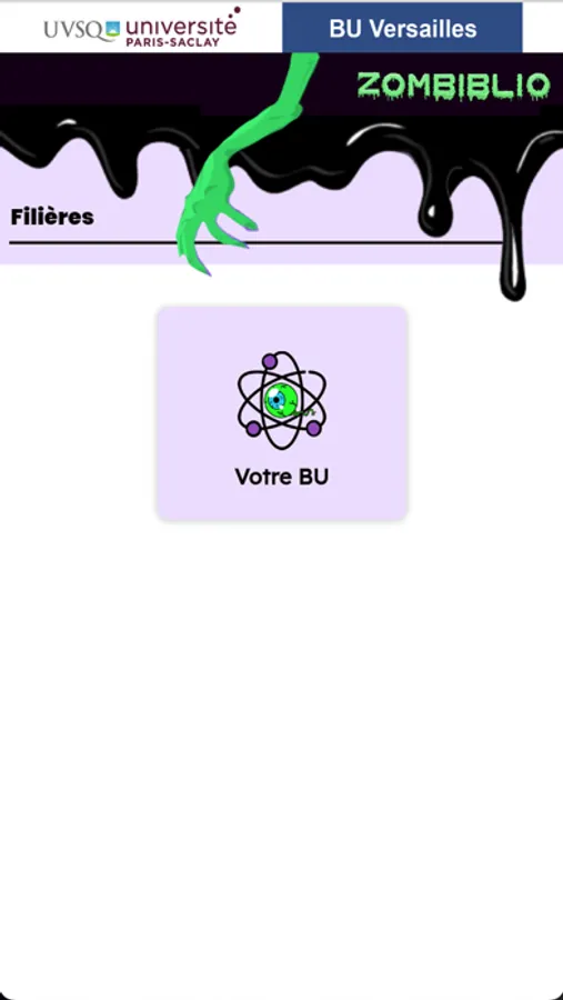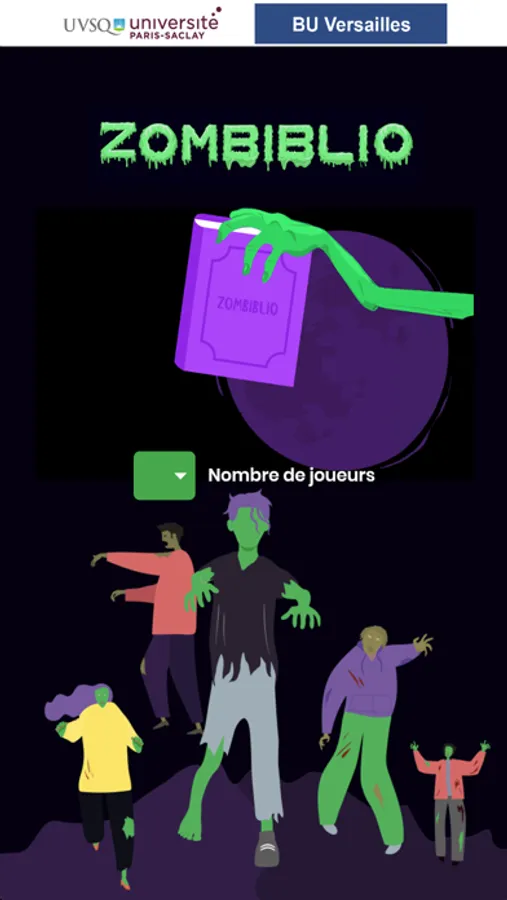 L’objectif du jeu Zombiblio BU Versailles est de faire découvrir, sur tablette ou smartphone, la bibliothèque de campus aux étudiants primo-arrivants (première année de licence ou d’IUT), pour le réseau de Bibliothèque Universitaire de Paris-Saclay.
