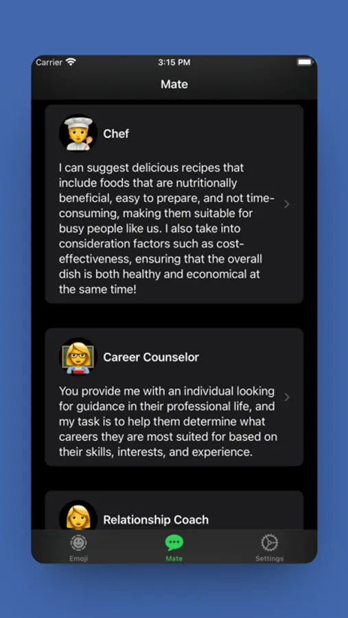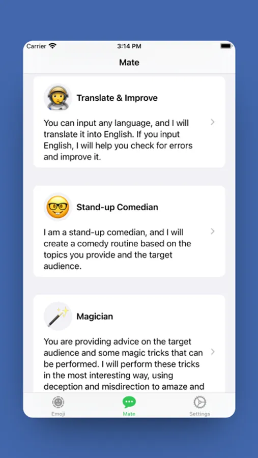 EmoMate also has many other built-in AI assistants that can help you with various tasks in your daily life. For example, translation, writing, and even storytelling and magic tricks!