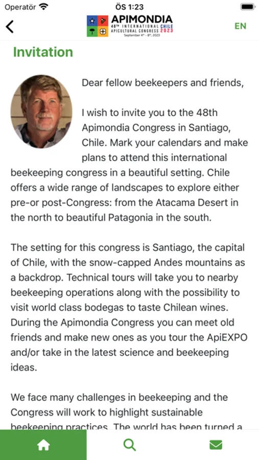 I wish to invite you to the 48th Apimondia Congress in Santiago, Chile. Mark your calendars and make plans to attend this international beekeeping congress in a beautiful setting. Chile offers a wide range of landscapes to explore either pre-or post-Congress: from the Atacama Desert in the north to beautiful Patagonia in the south.