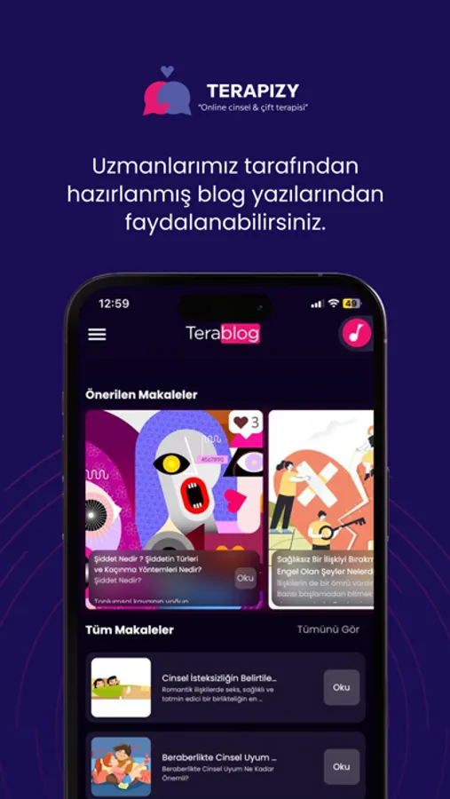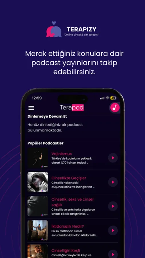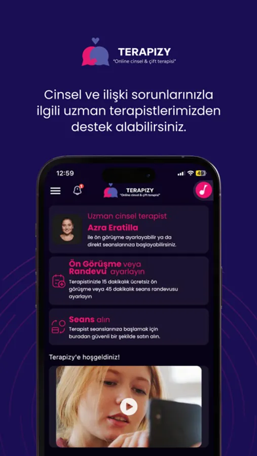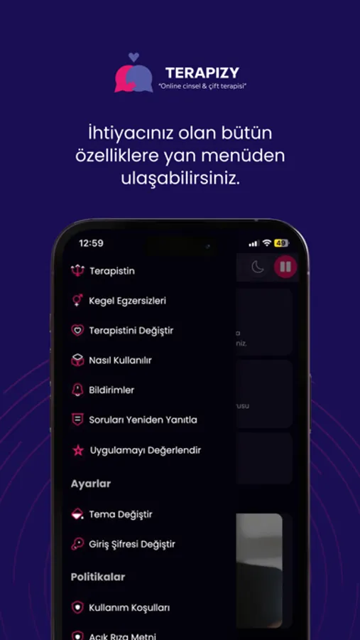 Terapistlerin profilini inceleyerek seçim yapabilir, randevularınızı kolayca planlayabilir ve anlık danışma taleplerinde bulunabilirsiniz. Terapizy, gizlilik ve kullanıcı güvenliği konularına önem vererek size sağlıklı bir cinsel yaşam için gereken desteği sunar. Terapizy'i indirerek daha mutlu ve tatmin edici bir ilişki için adım atın.