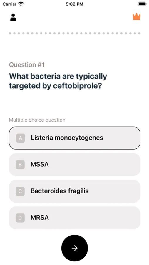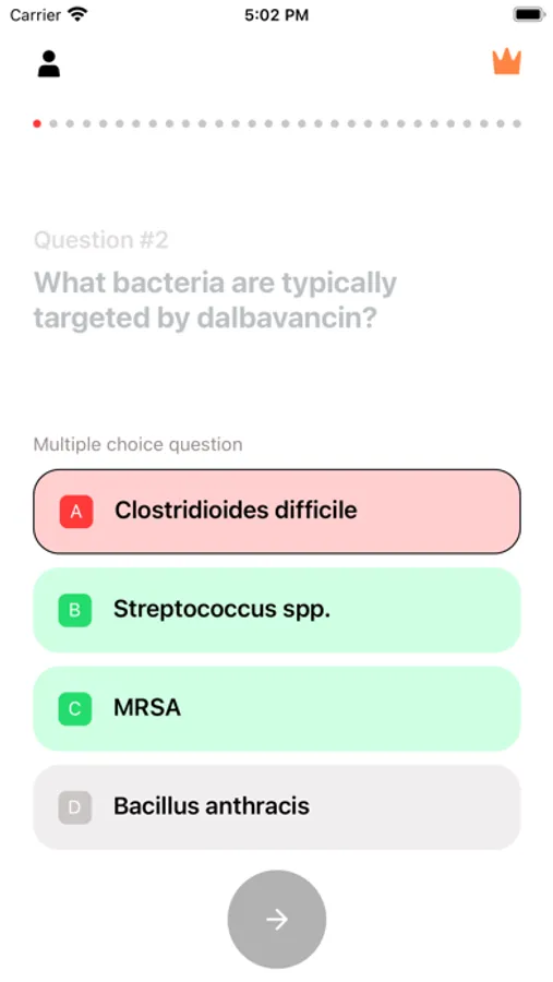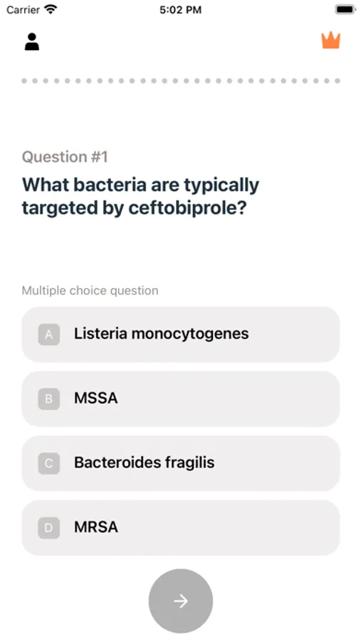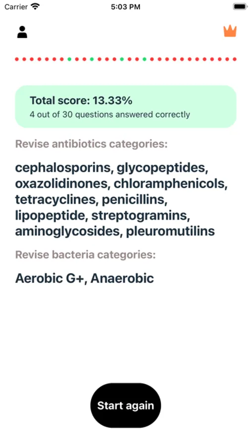 The app has a free part which includes questions related to the following bacteria - G+ aerobic, G- aerobic. The paid version provides access to the full database, including all bacteria classes: G+ aerobic, G- aerobic, anaerobic, and atypical & other.
