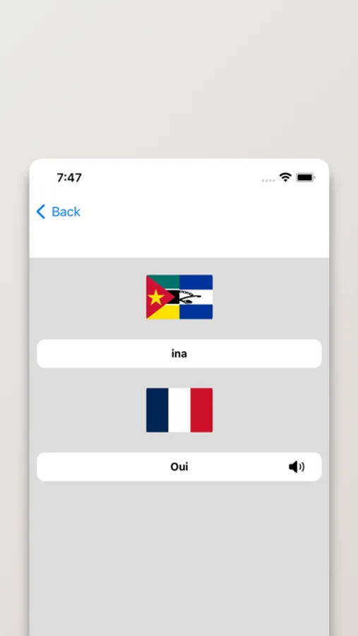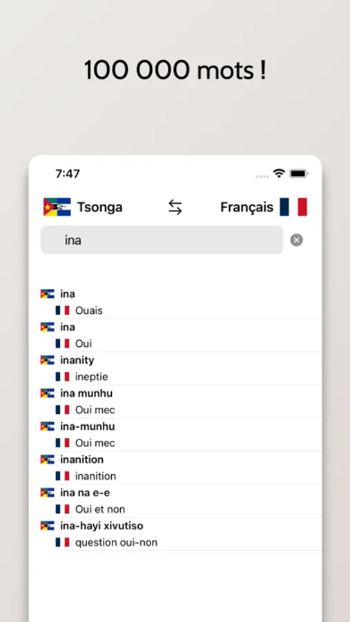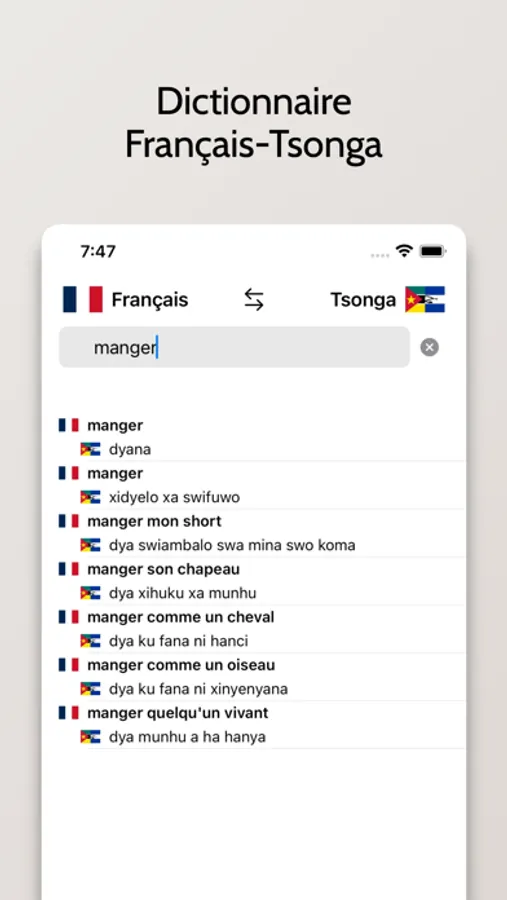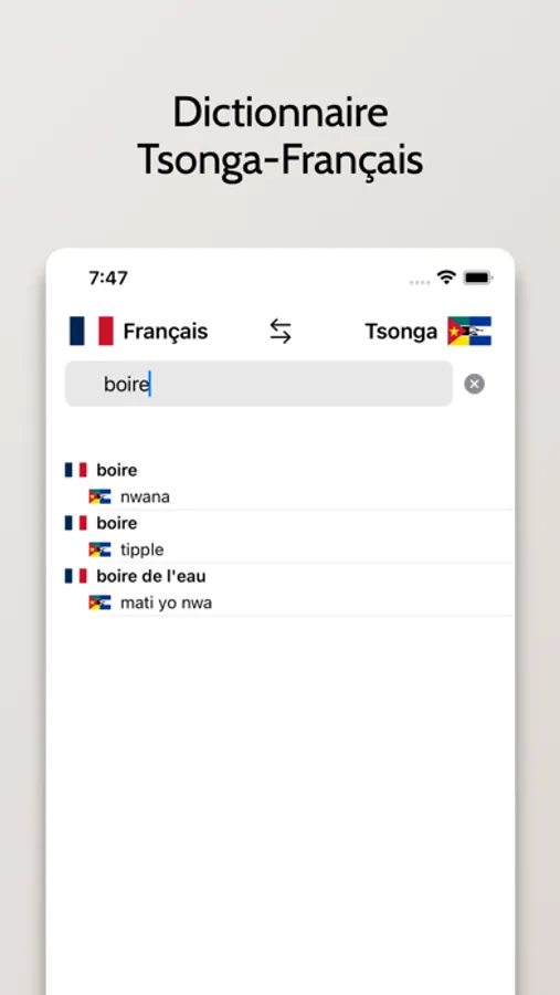 - Possibilité de rechercher à partir de mots en Français ou en Tsonga