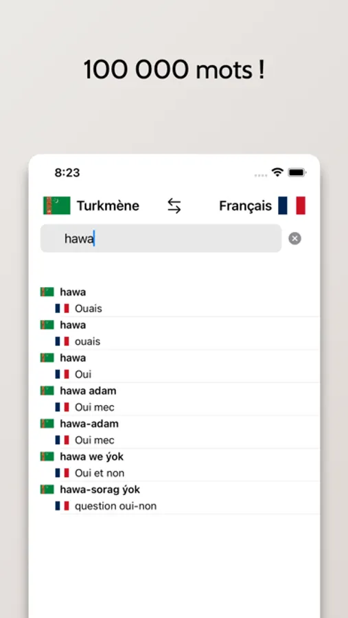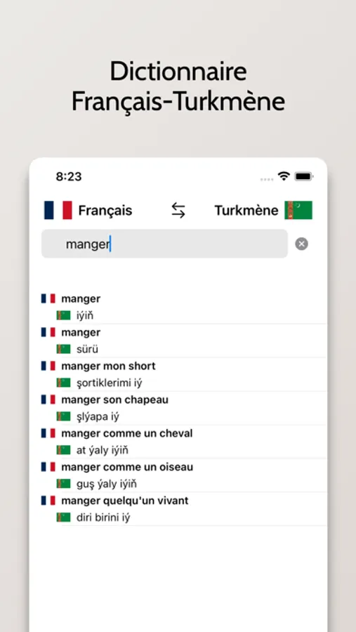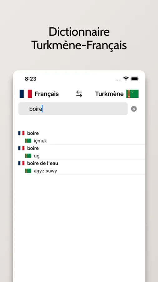 - Possibilité de rechercher à partir de mots en Français ou en Turkmène