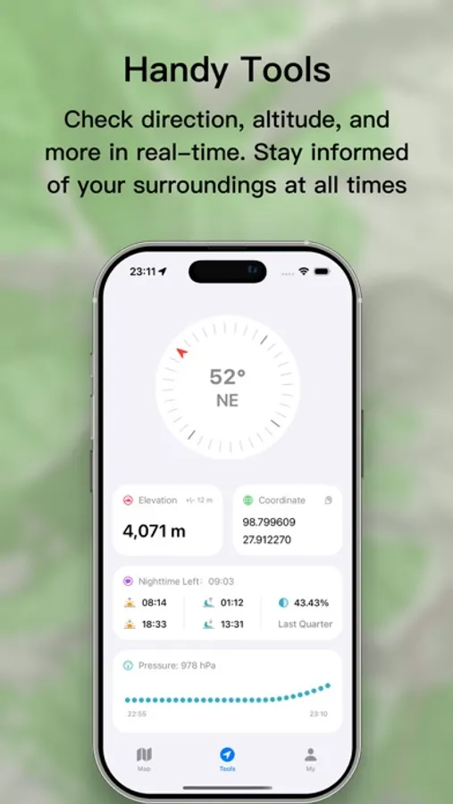Essential Outdoor Tools: Built-in tools like a compass, altimeter, coordinates, barometer, and sunrise/sunset data keep you informed about your surroundings in real-time.