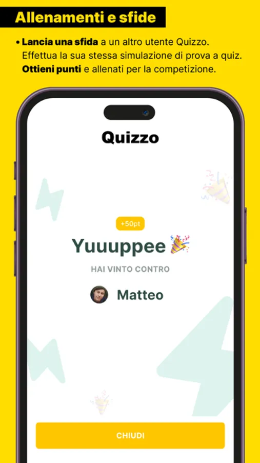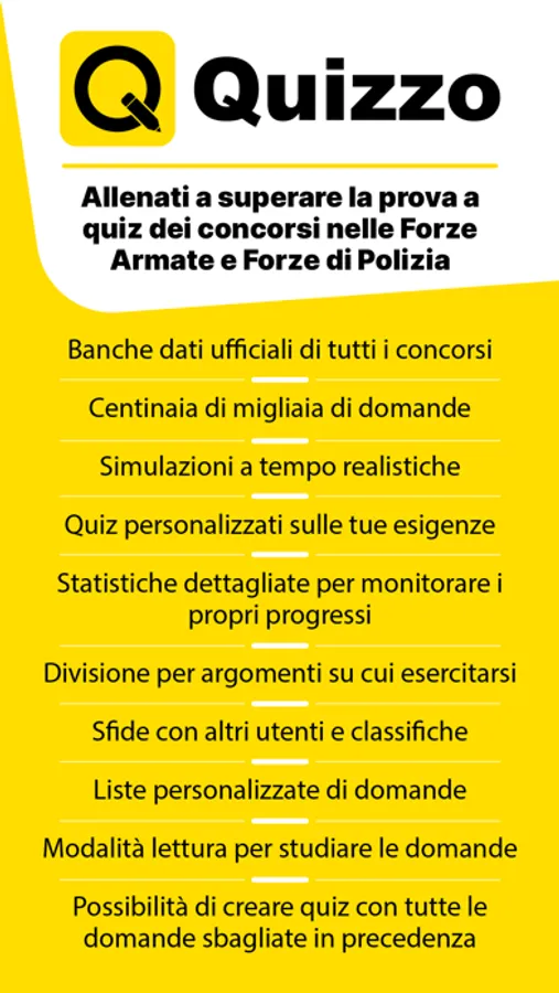 Quizzo è l’app perfetta per esercitarti a superare le prove a quiz dei concorsi ufficiali delle Forze Armate e Forze di Polizia italiane. All’interno dell’app troverai centinaia di migliaia di quiz, provenienti dalle banche dati ufficiali delle diverse amministrazioni. Le stesse domande da cui le Forze Armate e di Polizia attingono per creare la prova d’esame ufficiale che affronterai il giorno del concorso.