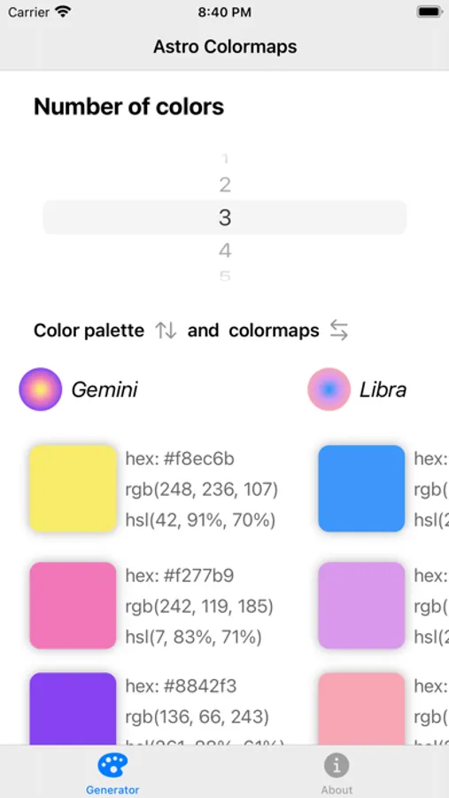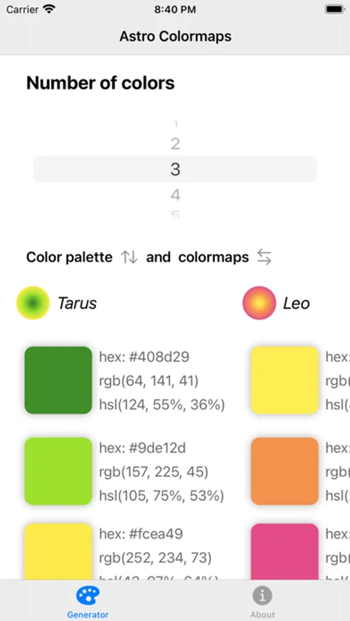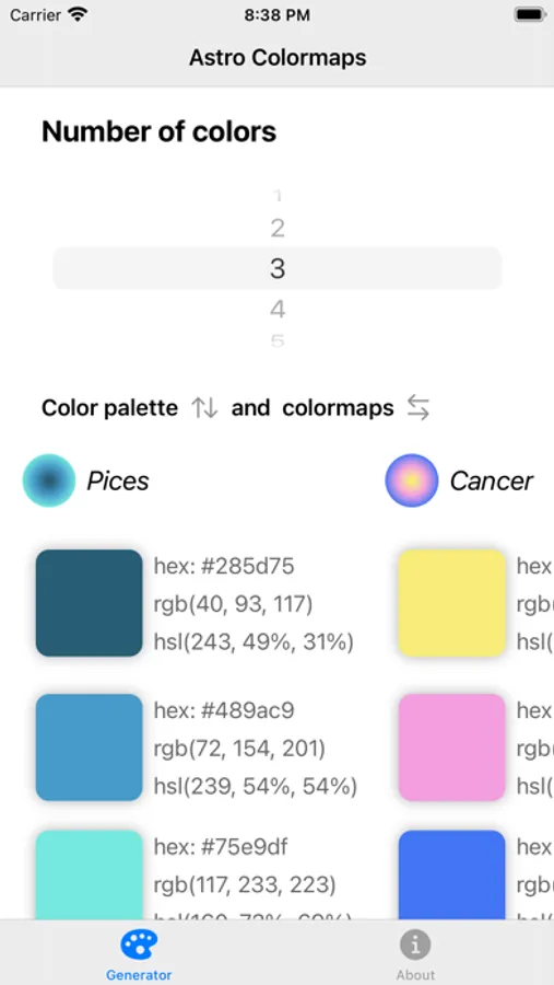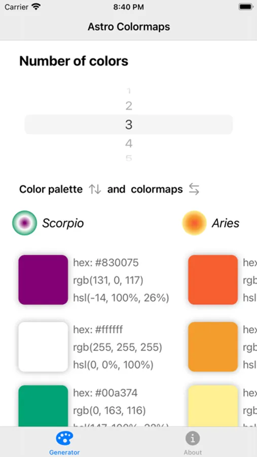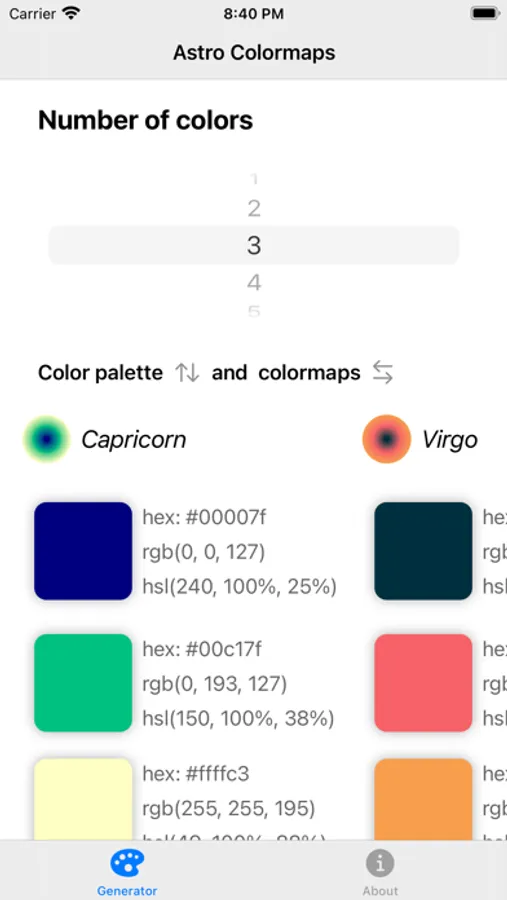 A selection of colormaps designed for each zodiac sign. Pick the number of colors and see what your sign has to offer. These maps are curated based on research and indicated for fun use.