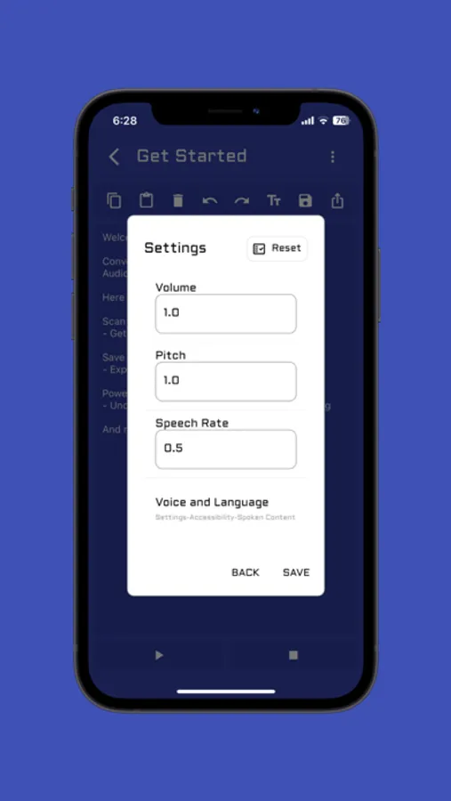 5. Voice Settings: Tailor your listening experience by customising the pitch, speed, and tone to match your preferences for a truly personalised listening journey.