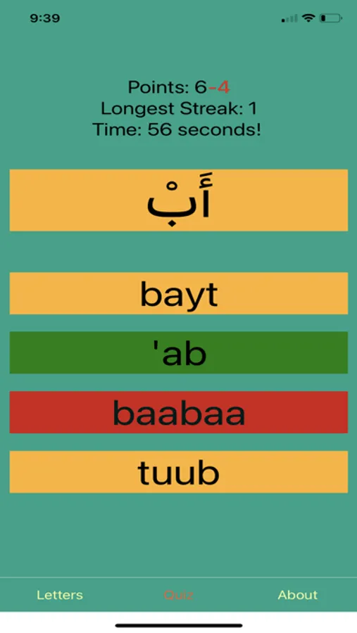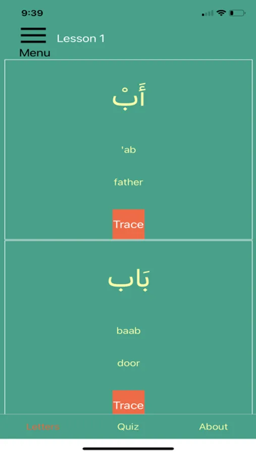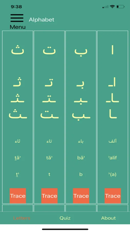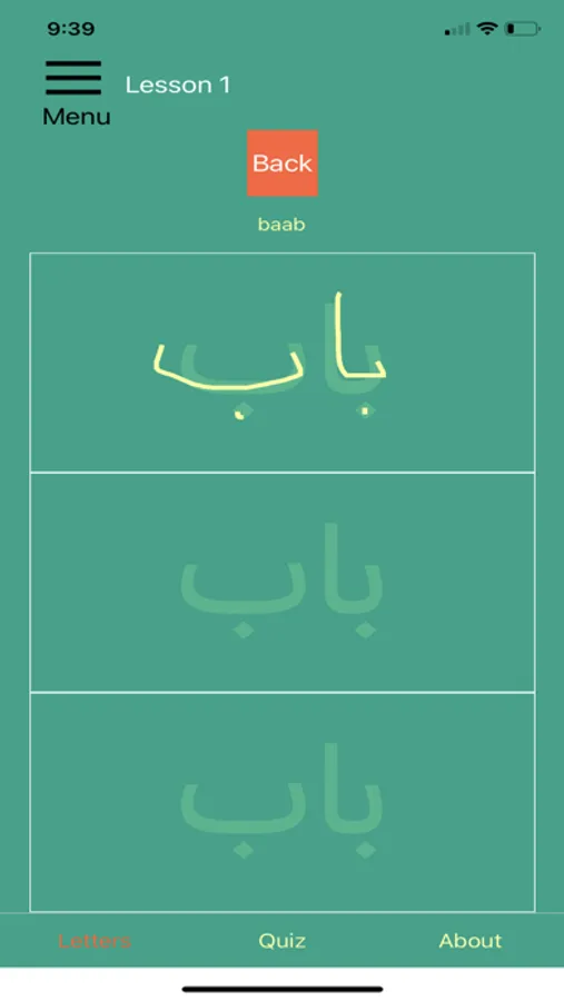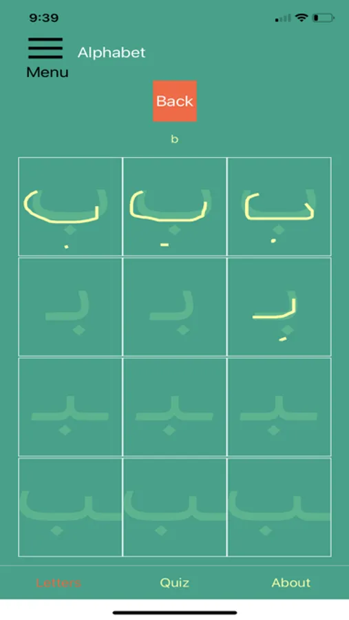 This app can teach you to read and write basic Arabic. Scroll through the letters and study their shapes and sounds. Practice tracing each one until you're familiar-- then quiz yourself on the letters!{"n"}