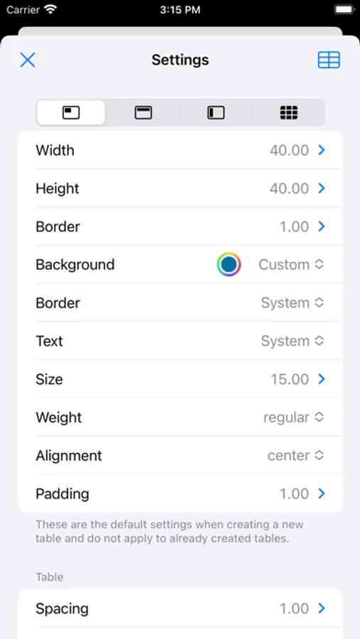 - Cell width/height/background color/frame color/text color