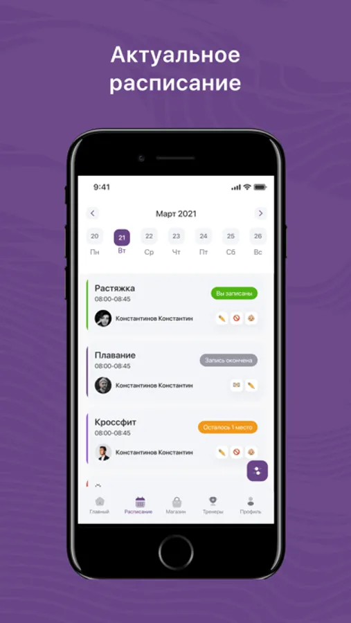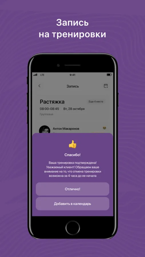- получать PUSH-уведомления о предстоящей тренировке за 3 часа;