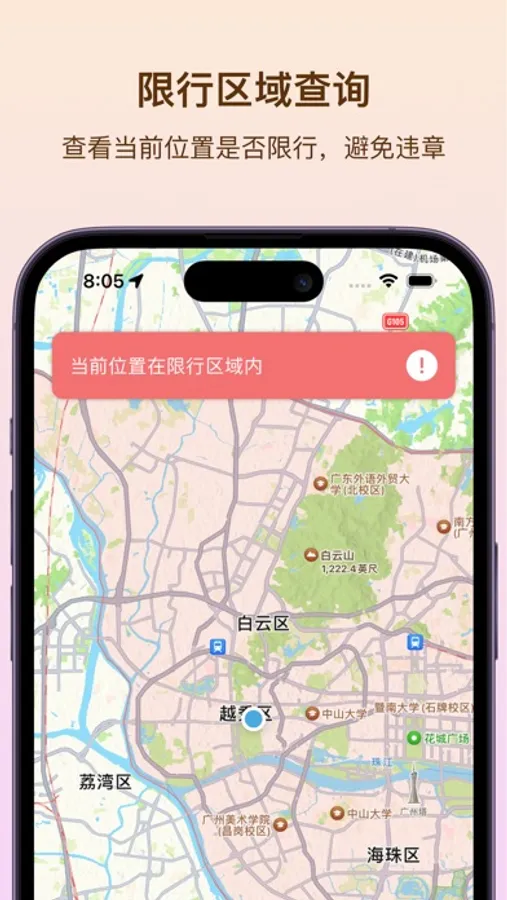 - 限行区域查询,查看当前位置是否位于限行区域内