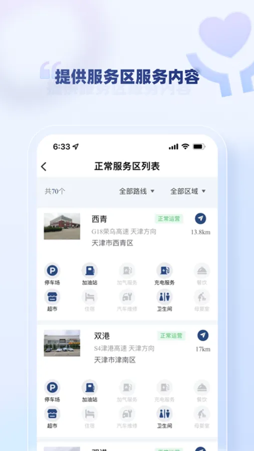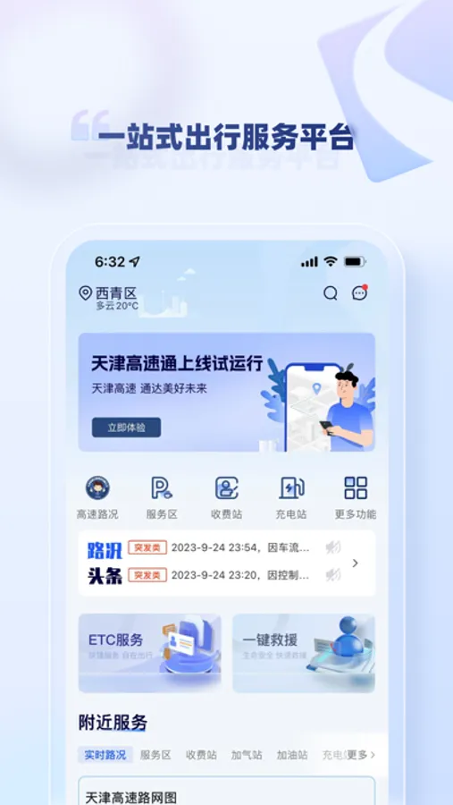 天津高速通主要为天津高速用户提供便捷的基础出行服务 。包括:高速路况、服务区状态、收费站状态、路况信息、资讯、一键救援、出行常识、我的附近、智能客服等