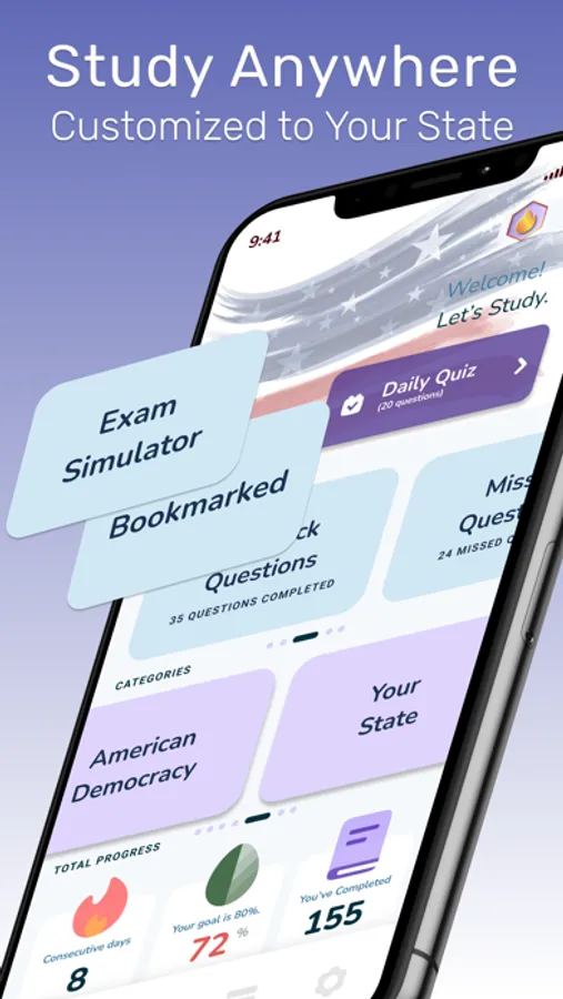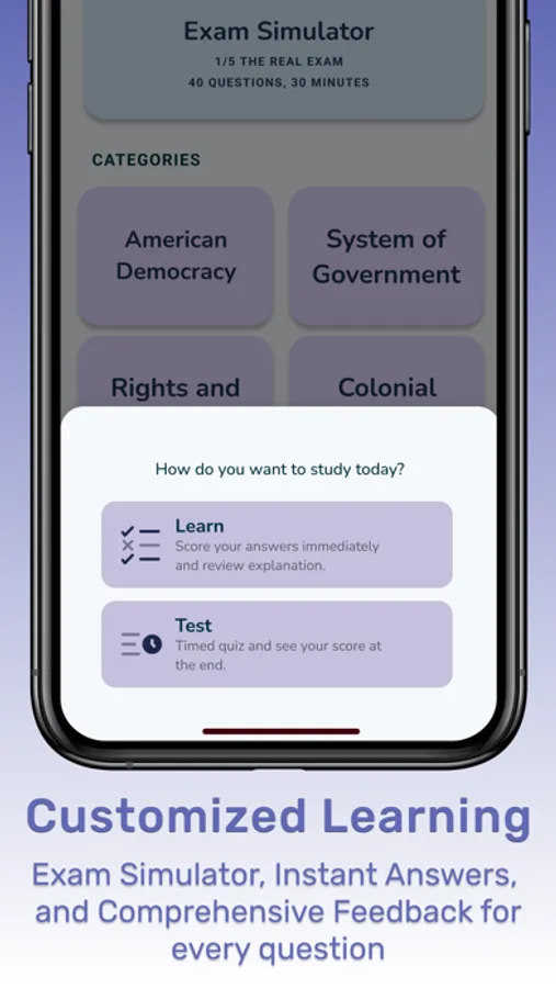 What sets EZ Prep apart from other study apps, like Citizen Now and others? First, it was made in the USA, unlike many other study apps. Second, you will not only learn how to answer each question correctly but also the history behind the answer. Unlike other apps, it creates personalized learning plans with dynamic questions that get progressively harder based on your preferences and goals.