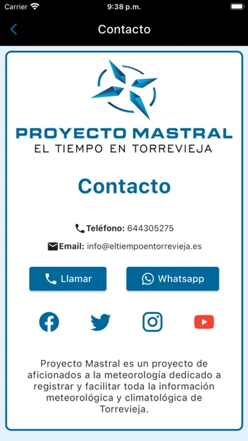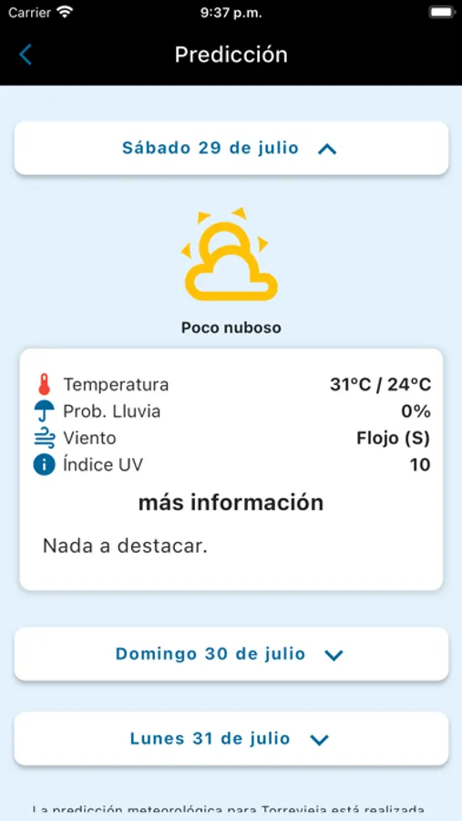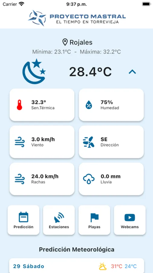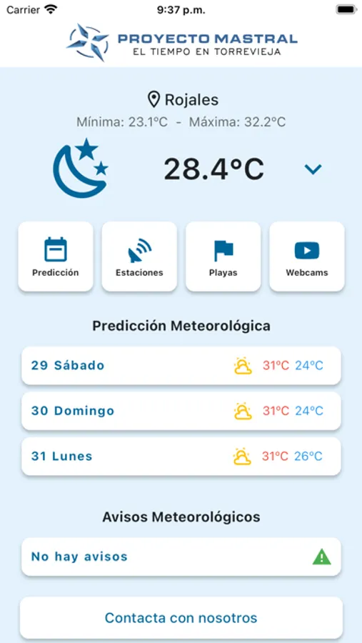 La única aplicación que te da datos fiables de las condiciones meteorológicas en Torrevieja gracias a las catorce estaciones meteorológicas instaladas en la ciudad. También podrás conocer el tiempo en Los Montesinos, Daya Nueva, Pilar de la Horadada, Rojales y San Miguel de Salinas. Además, conoce las predicciones del tiempo a tres días, información sobre avisos meteorológicos y el estado de las playas de Torrevieja.