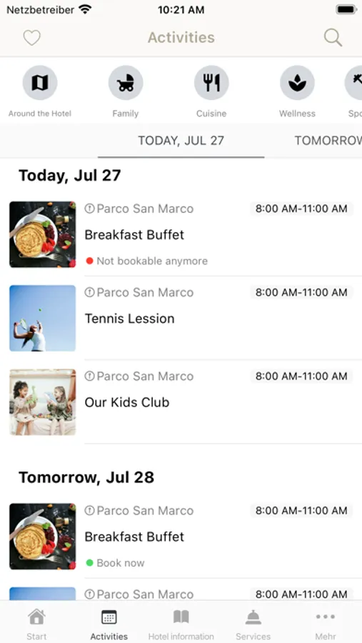 Important standard information about Parco San Marco, such as location and directions, as well as opening hours of the restaurant and reception, are prepared for you in the app.