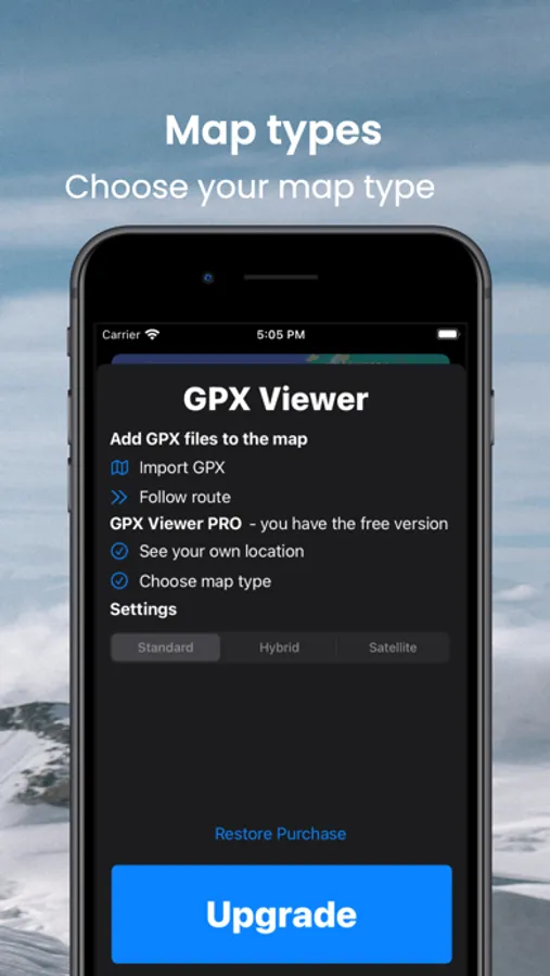 Pro Version Perks: Unlock the full potential of GPX Viewer with our Pro version, offering exciting additional features, such as multiple map types, standard, hybrid, satellite and extended tracking capabilities. Upgrade to Pro for an enhanced and premium adventure experience.