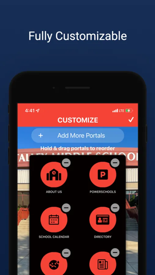 Your Talley app is fully customizable by you: Rearrange your portals to easily access whichever features you use most. If you want to check school events frequently, you can put that portal front and center. If you never check school social media, you can turn that portal off.
