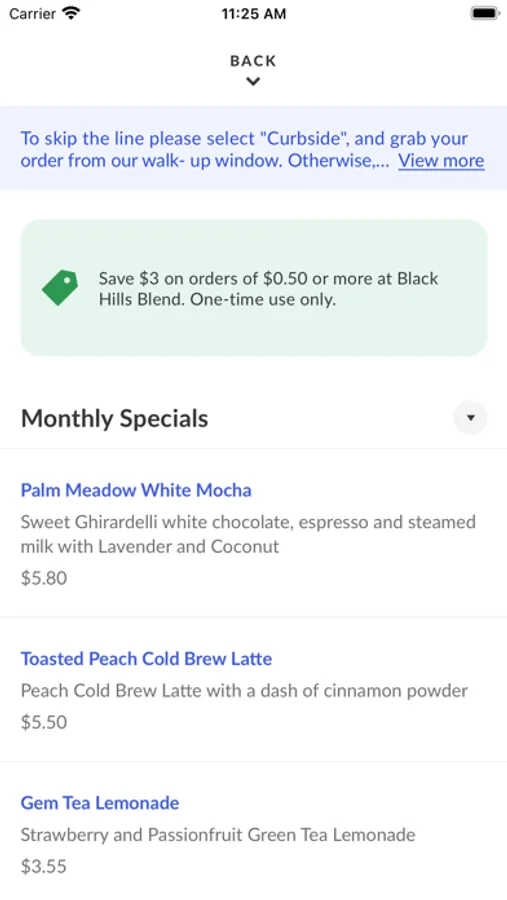 With the Black Hills Blend mobile app, ordering food has never been easier. Whether you're looking for a quick snack or a full meal, we've got you covered. Just browse our easy-to-use menu, customize it how you'd like, place your order using our secure payment system, and sit back! A push notification will alert you when your order will be ready.
