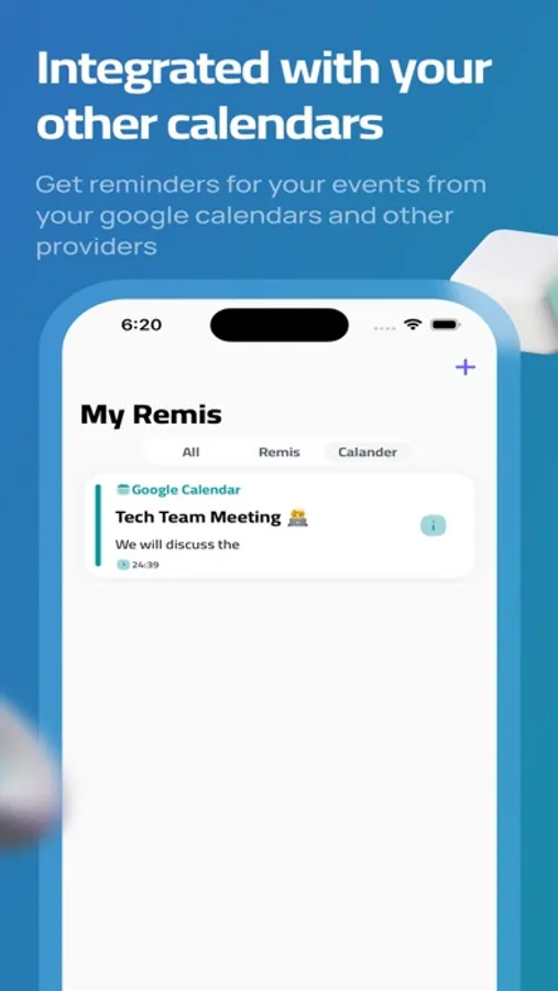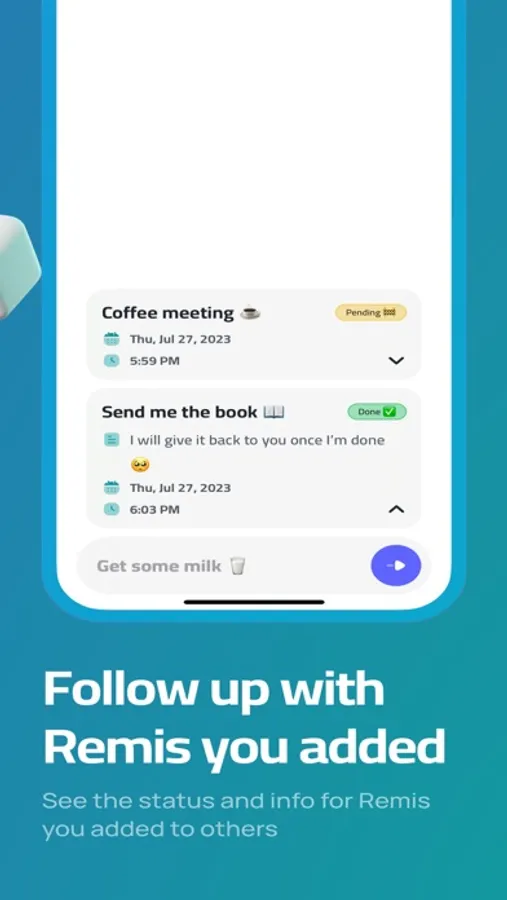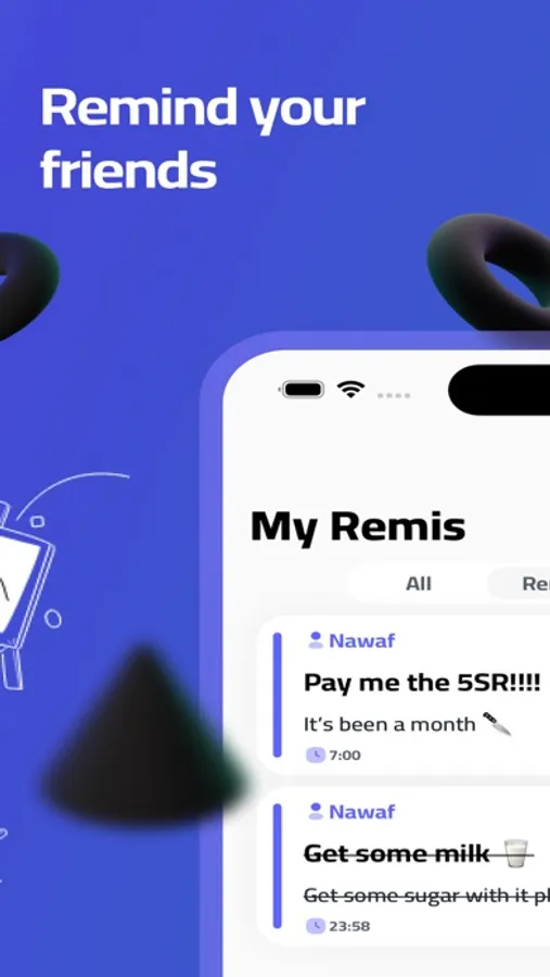 Remi App is more than a reminder app! Add your family and friends a reminder and let Remi app reminds them. You can remind a friend with a dinner, or remind your sun to do his homework. Try RemiApp now.