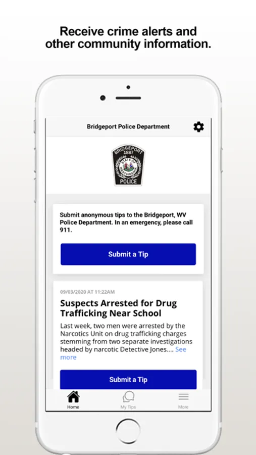 The Bridgeport PD app provides citizens the ability to submit anonymous tips to the Bridgeport, WV Police Department. The app also displays agency crime alerts and other organization web and social media content.