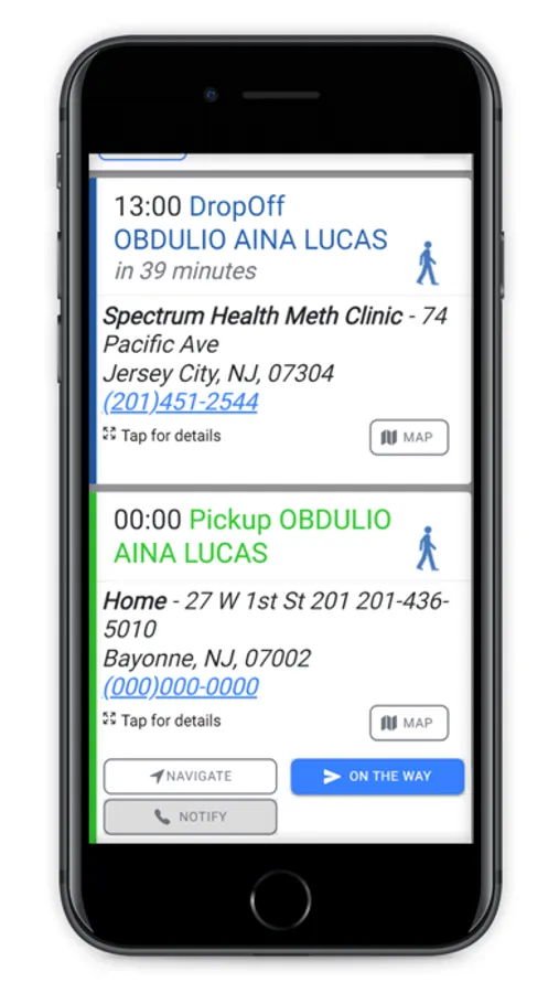 Ecolane Drive allows drivers who have registered with their transit agency to receive and perform trips on their Apple devices. After logging in, a driver will see any trips assigned to their run to perform. Trips will be listed including pick-up address, drop-off address, and any specific information for the passenger and locations.