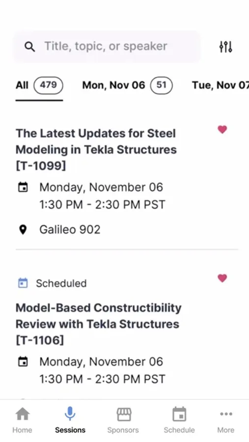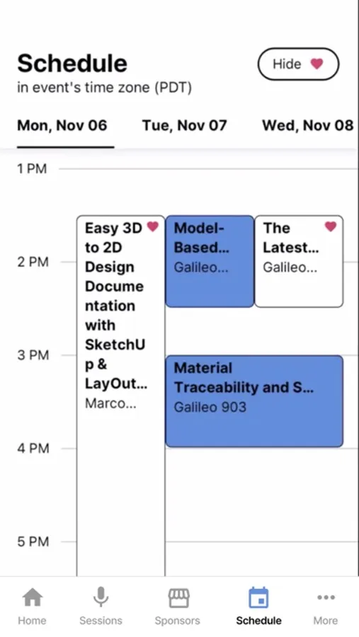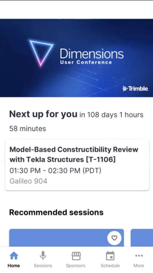 With the Trimble Dimensions app attendees can access the content catalog to make schedule changes, review information on speakers and session participants, view the exhibitor catalog including booth location and information, view push notifications with important event alerts, access their attendee portal, take surveys and more.