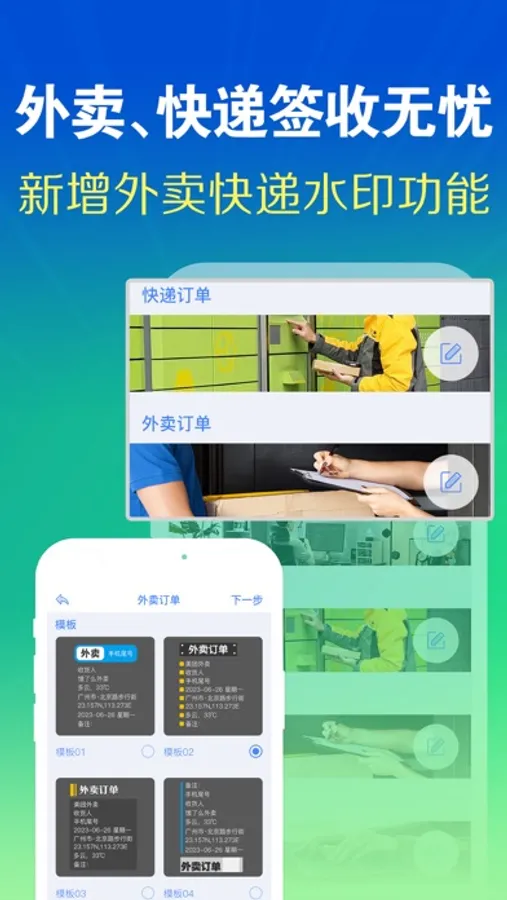 上班打卡、旅游打卡、居家值班、工程记录、执勤巡逻、保洁记录、快递订单、外卖订单、会议记录、自定义等等各类水印应有尽有,水印模板将不定期更新,手指点点更新一下,即可免费拥有最新水印模板。用户反馈所需,我们即可添加用户所需的模板;