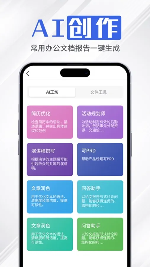 - 创新AI创作功能,一键生成文章、演讲稿、调研报告、周报、优化简历等内容助力创作。