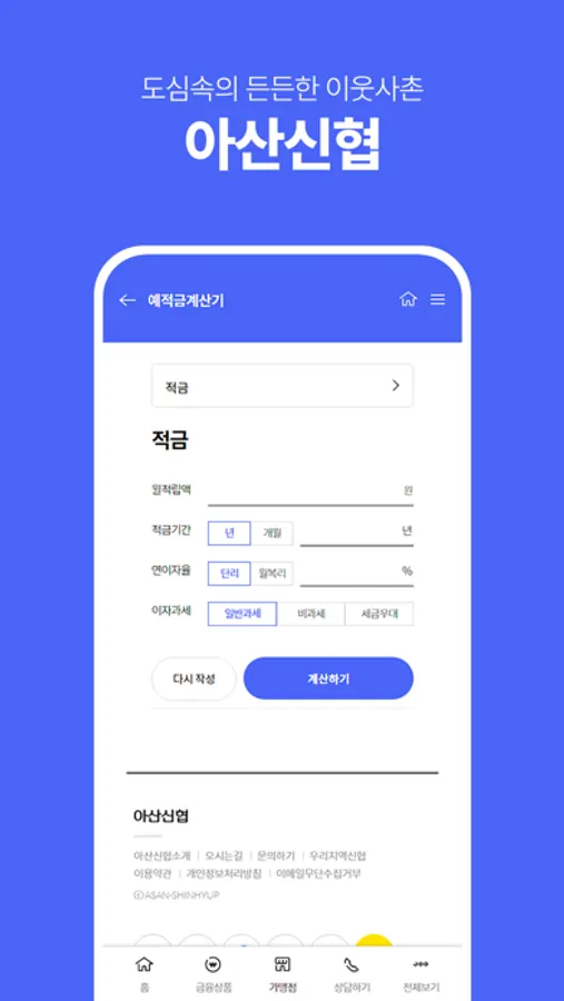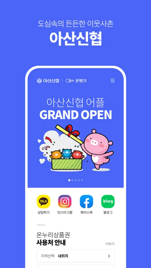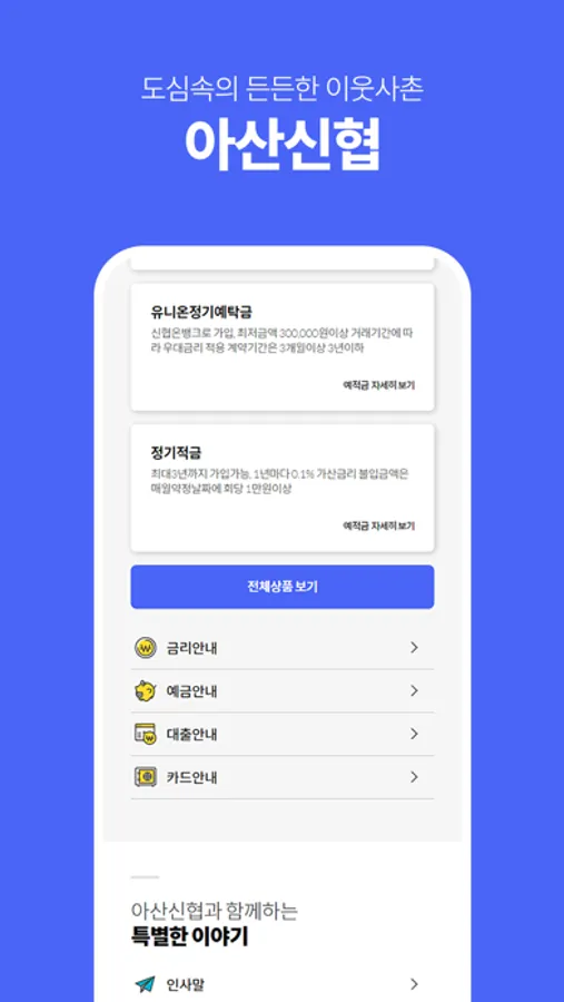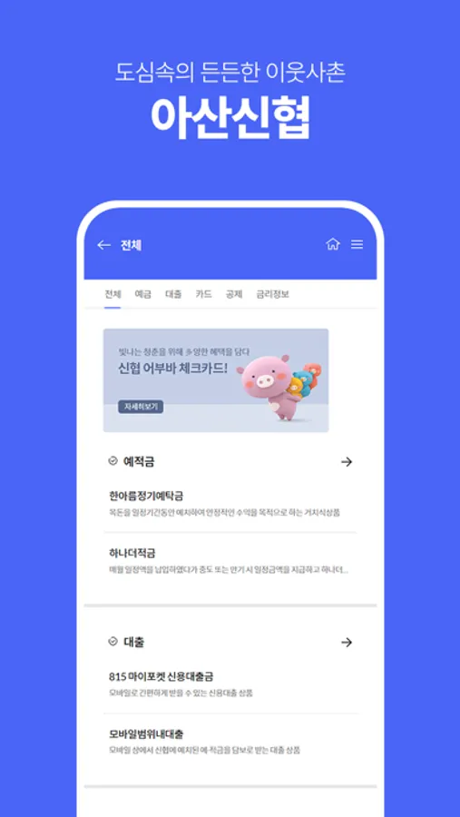 조합원 제휴 혜택 및 예·적금, 대출, 카드 등의 금융 정보와 아산신협의 다양한 소식 등을 편하게 받아볼 수 있는 서비스 입니다.