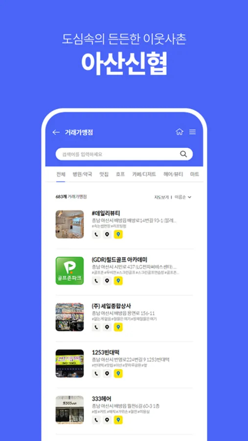 아산신협 앱은 우리 지역의 온누리상품권 가맹점 및 거래 가맹점을 위치 기반 서비스를 통해 쉽게 확인할 수 있으며,