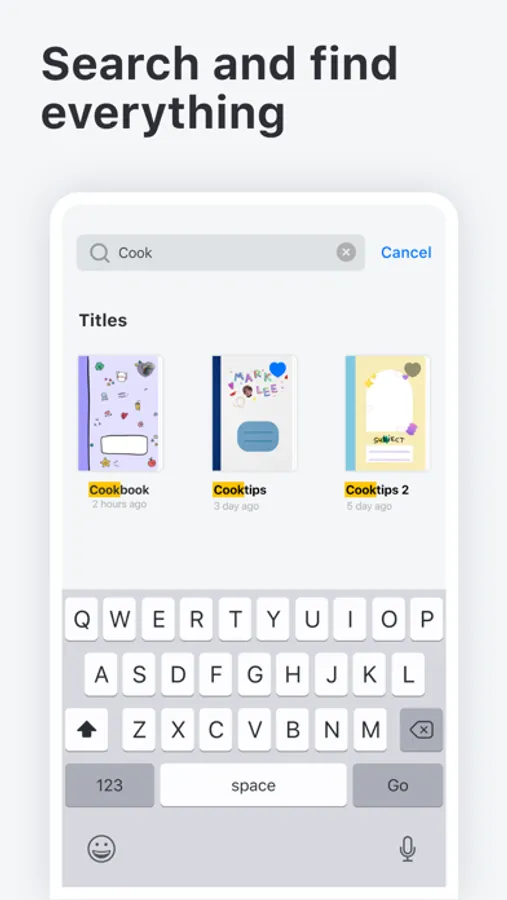 * Everything is indexed: Search your handwritten notes, typed text, PDF text, document outlines, folder titles, and document titles