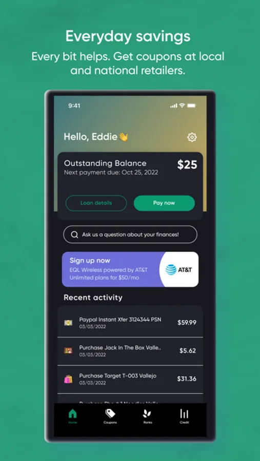 Get started in just 2 minutes by connecting your bank account and telling us where you work. We never check your credit. We support 10,000+ financial institutions, including Bank of America, Wells Fargo, Chase, Navy Federal Credit Union, and USAA.