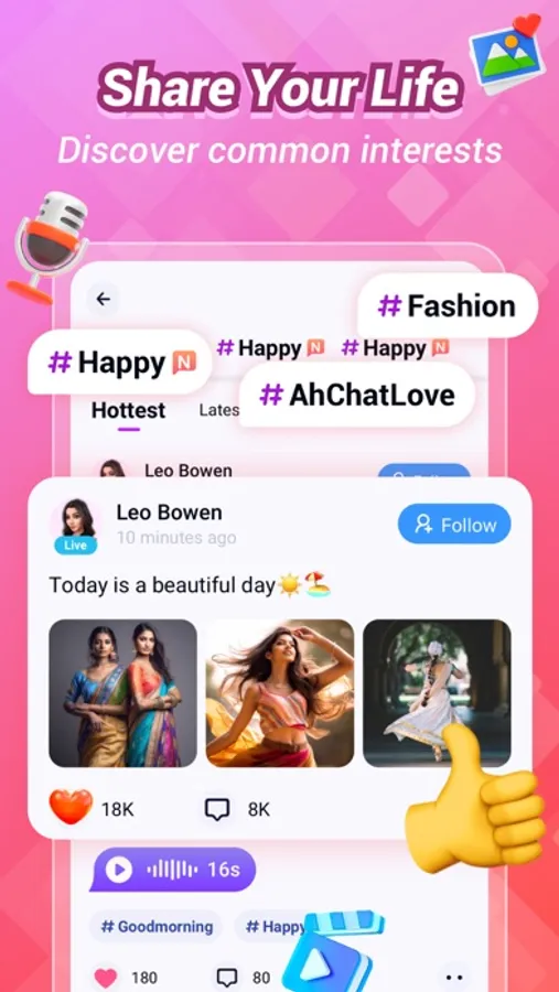 Our mission is to ensure that our users are free from scams and dangers while using AhChat to make friends.The platform is strictly audited and controlled around the clock to maintain an open and safe social environment, allowing our users to communicate with real and kind people.