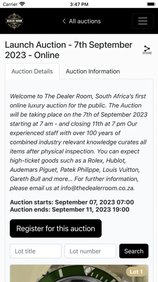 If you need to join and bid online at a Dealer Room auction, simply download the app to register and take part in the online bidding. Register for an account. Once approved you can bid online. Watch an auction in real-time and access our auction from anywhere.