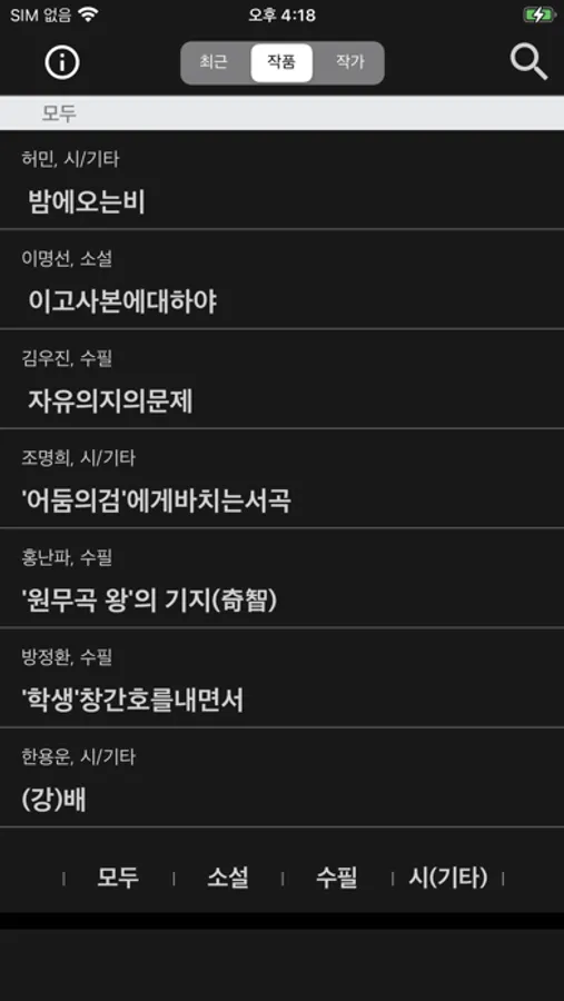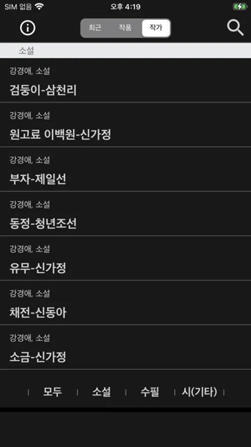 ** 앱에서 제공하는 소설, 수필, 시등의 파일은 “공유마당” 사이트에서 저작권법에 의해 저작권이 만료된 파일만 서비스 합니다. (작가 사후 70년이 넘은 작품)