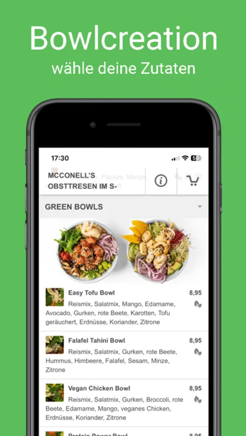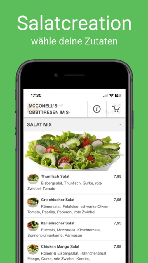 Lassen Sie Ihrer Fantasie freien Lauf und kreieren Sie Ihren eigenen Salatmix aus unserem reichhaltigen Angebot mit über 60 Zutaten. Wählen Sie aus verschiedensten Salat- und Gemüsesorten, diversen anderen leckeren Zutaten und unseren schmackhaften Dressings. Die Salate eignen sich sowohl für den gesunden Snack zwischendurch als auch für eine richtige vollwertige Mahlzeit. McConell’s Obsttresen bietet auch für Vegetarier und Veganern eine große Auswahl an täglich frischen Zutaten. Unsere Mitarbeiter beraten Sie bei der Zusammenstellung sehr gerne. In wenigen Schritten können sie einen vitaminreichen Salat nach Ihren Vorstellungen kreieren und direkt genießen