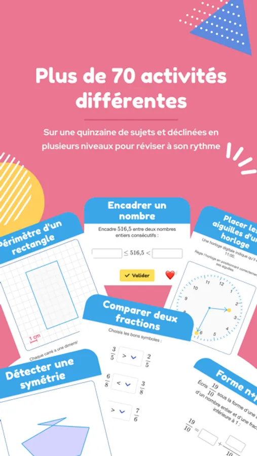 Notre équipe de didacticiens a développé 70 activités randomisées les savoir-faire mathématiques du programme de la classe de CM1, permettant à chacun de s'exercer autant de fois que nécessaire jusqu'à leur acquisition. Elles permettent d'activer ou réactiver les connaissances pour valider une acquisition de compétence et réviser pendant les vacances.