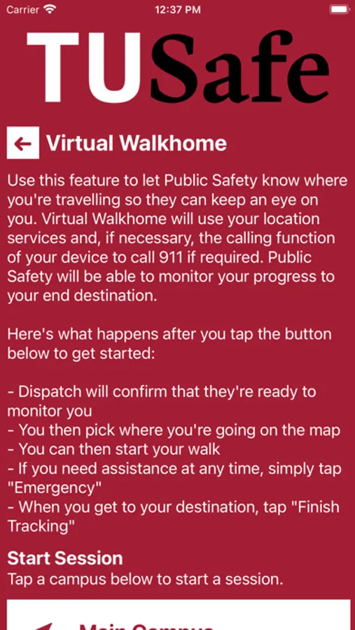- Virtual WalkHome: Allow Campus Security to monitor a user’s walk. If a user feels unsafe when walking on campus, they can request a Virtual WalkHome and a dispatcher on the other end will monitor their journey until they reach their destination.
